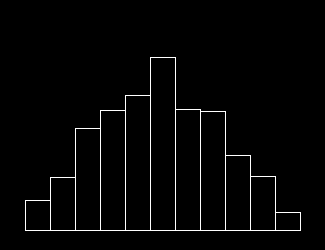 sum_two_dice(): should generate two random integers 1 to 6 and return their sum.roll_dice(num): should rollnumpairs of dice (by callingsum_two_dice) and counting the number of 2s, 3s, 4s, ..., 12s rolled. It should return a list of the count of each roll that occurred (i.e. a list of ≈12 elements that would sum tonum).draw_histogram(counts): that takes the counts produced by the previous function, creates and image, draws the histogram (using ImageDraw methods), and returns andImagelike this:def draw_histogram(counts): img = Image.new("RGB", (img_width, img_height)) ... return img